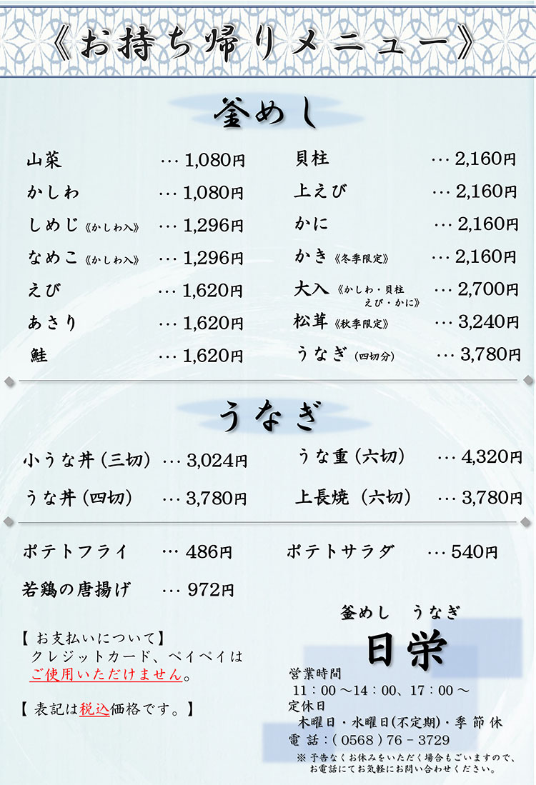 ◆うなぎ(四切分)・・・3,850円(◆3,780円)